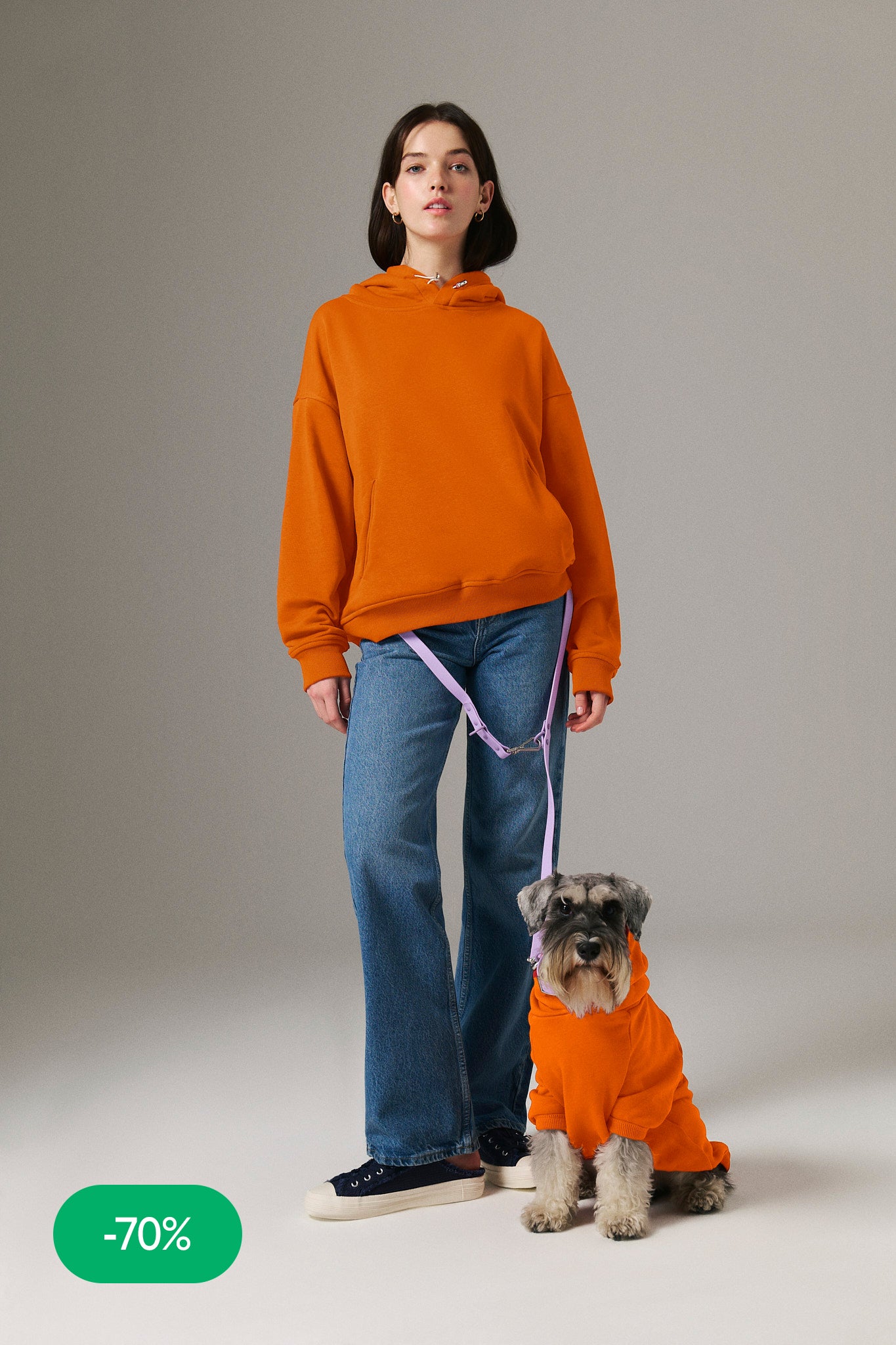 Köpek: Yumuşacık pamuklu üç iplik kumaştan, manşetleri ve etek ucu ribanalı, kolay ve rahat yürüyüşler için tasma deliği bulunan, rahat kesim kapüşonlu sweatshirt
