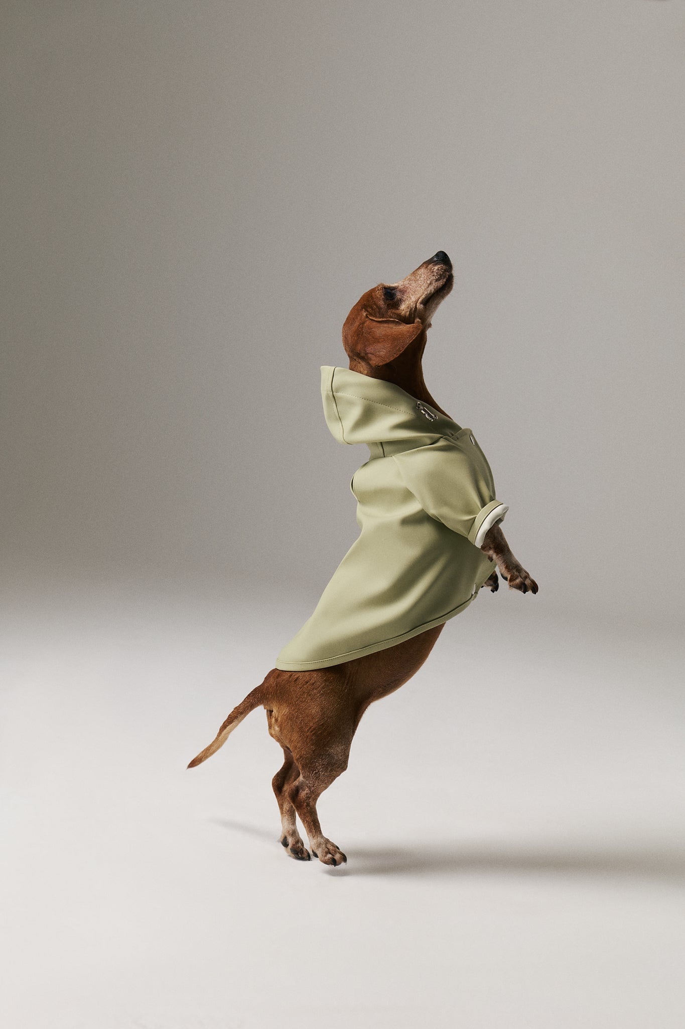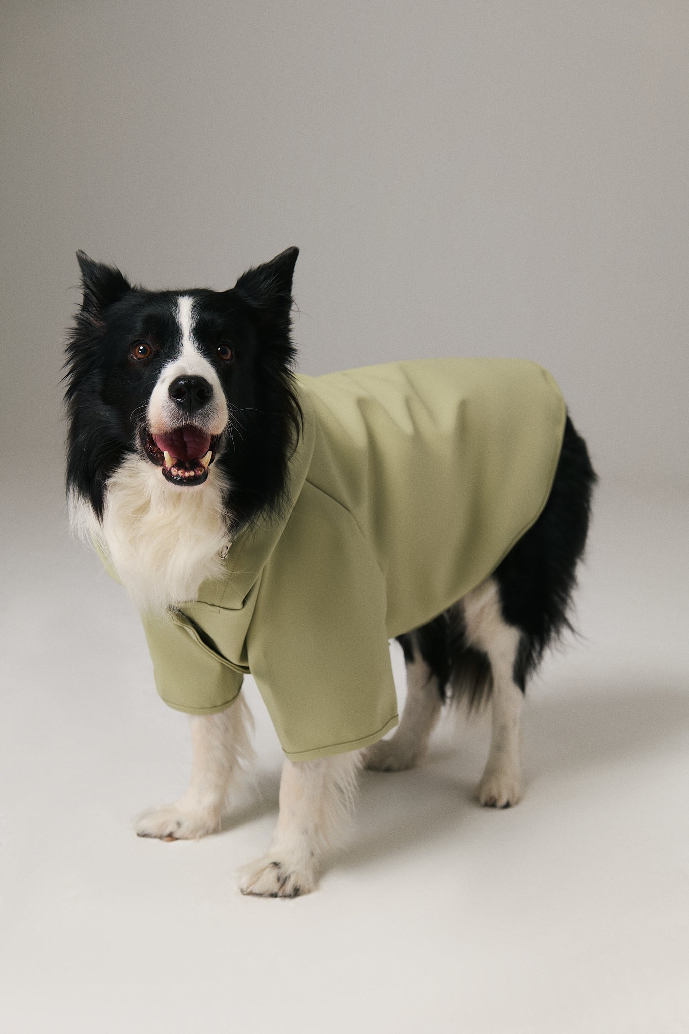 Köpek: Mat ve pürüzsüz bir yüzeye sahip suya dayanıklı hafif kumaştan üretilmiş, kapüşonu lastik ve stoperle ayarlanabilen, önü çıtçıtlı, kolay ve rahat yürüyüşler için tasma deliği bulunan astarsız rahat kesim yağmurluk
