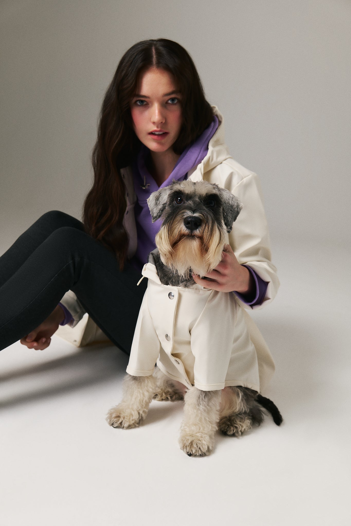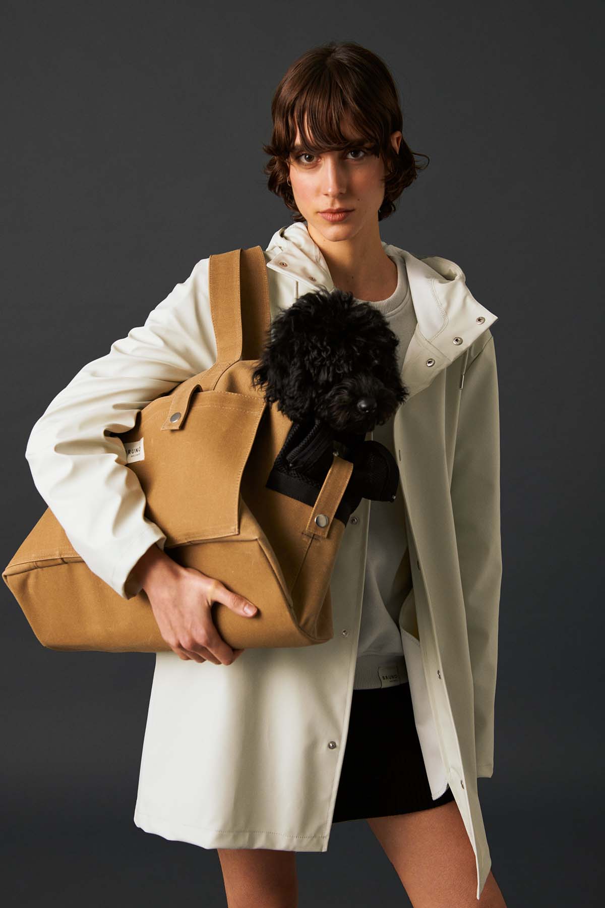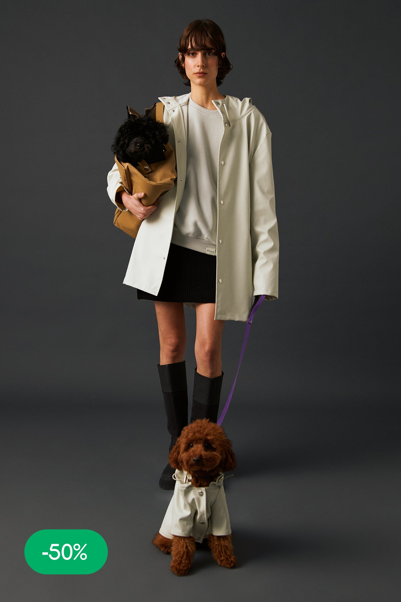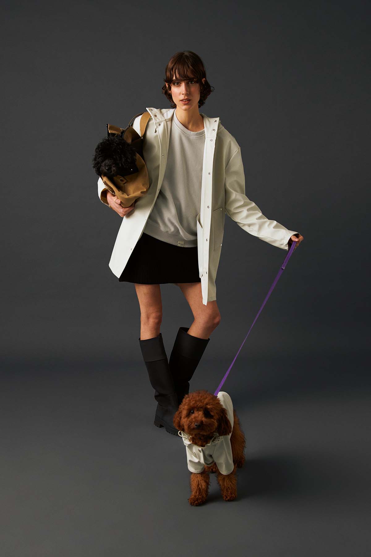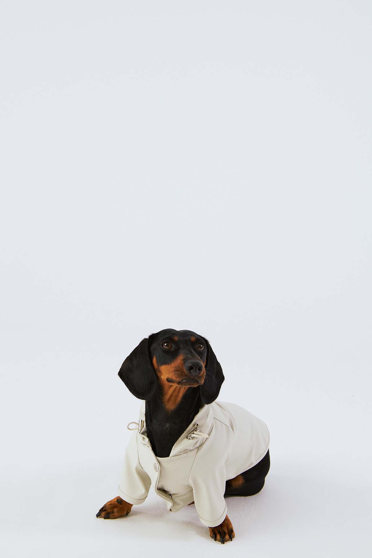 Köpek: Mat ve pürüzsüz bir yüzeye sahip suya dayanıklı hafif kumaştan üretilmiş, kapüşonu lastik ve stoperle ayarlanabilen, önü çıtçıtlı, kolay ve rahat yürüyüşler için tasma deliği bulunan astarsız rahat kesim yağmurluk