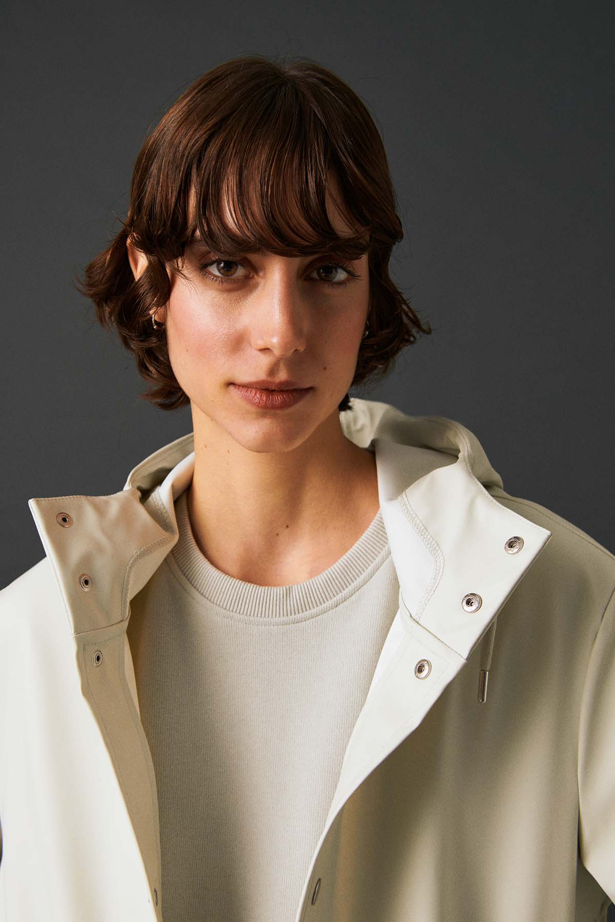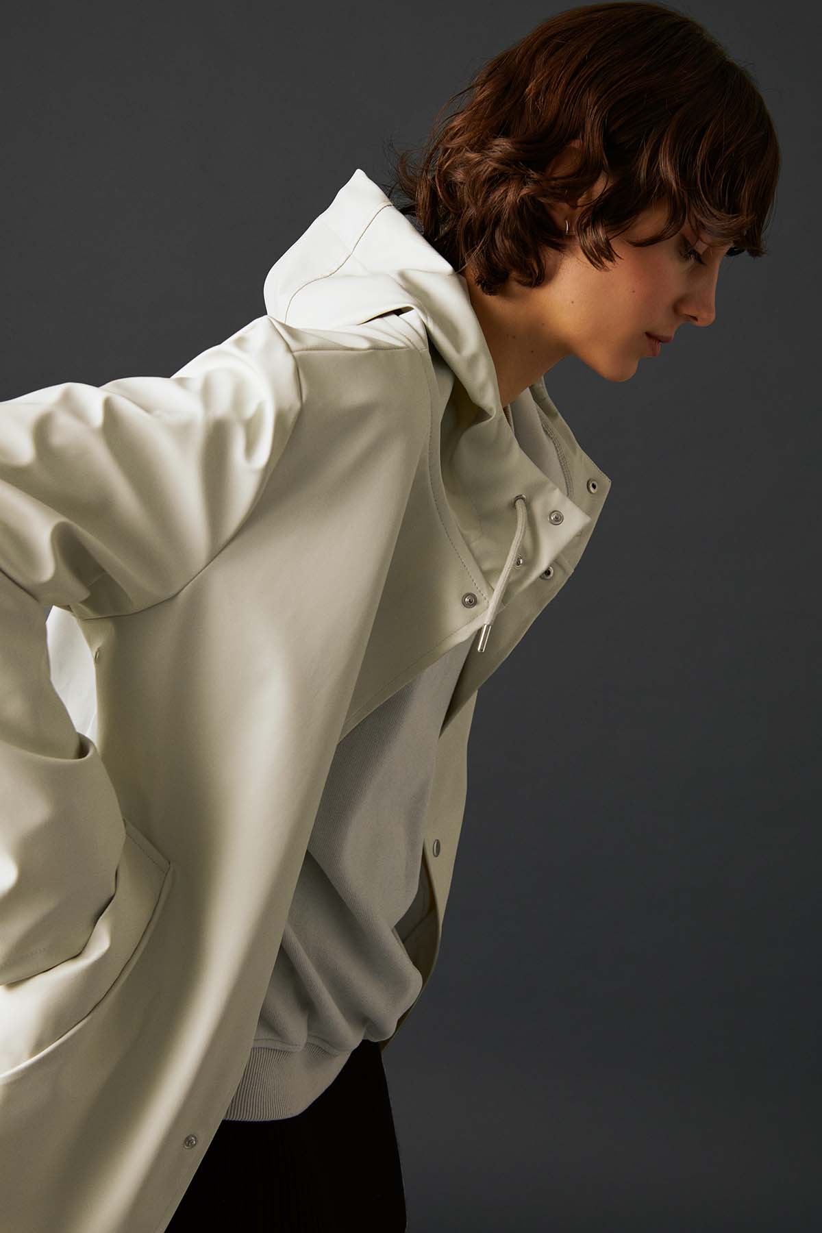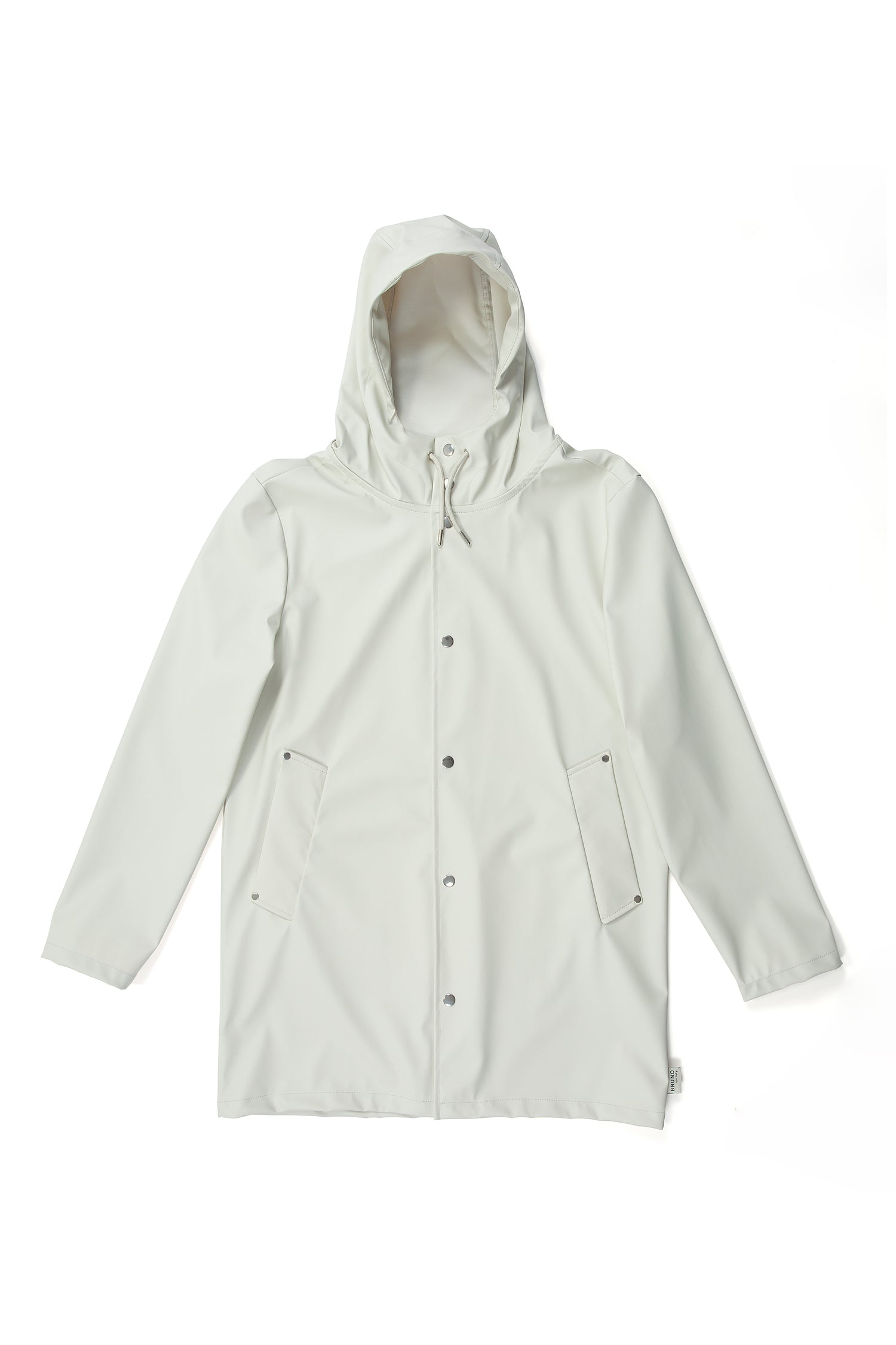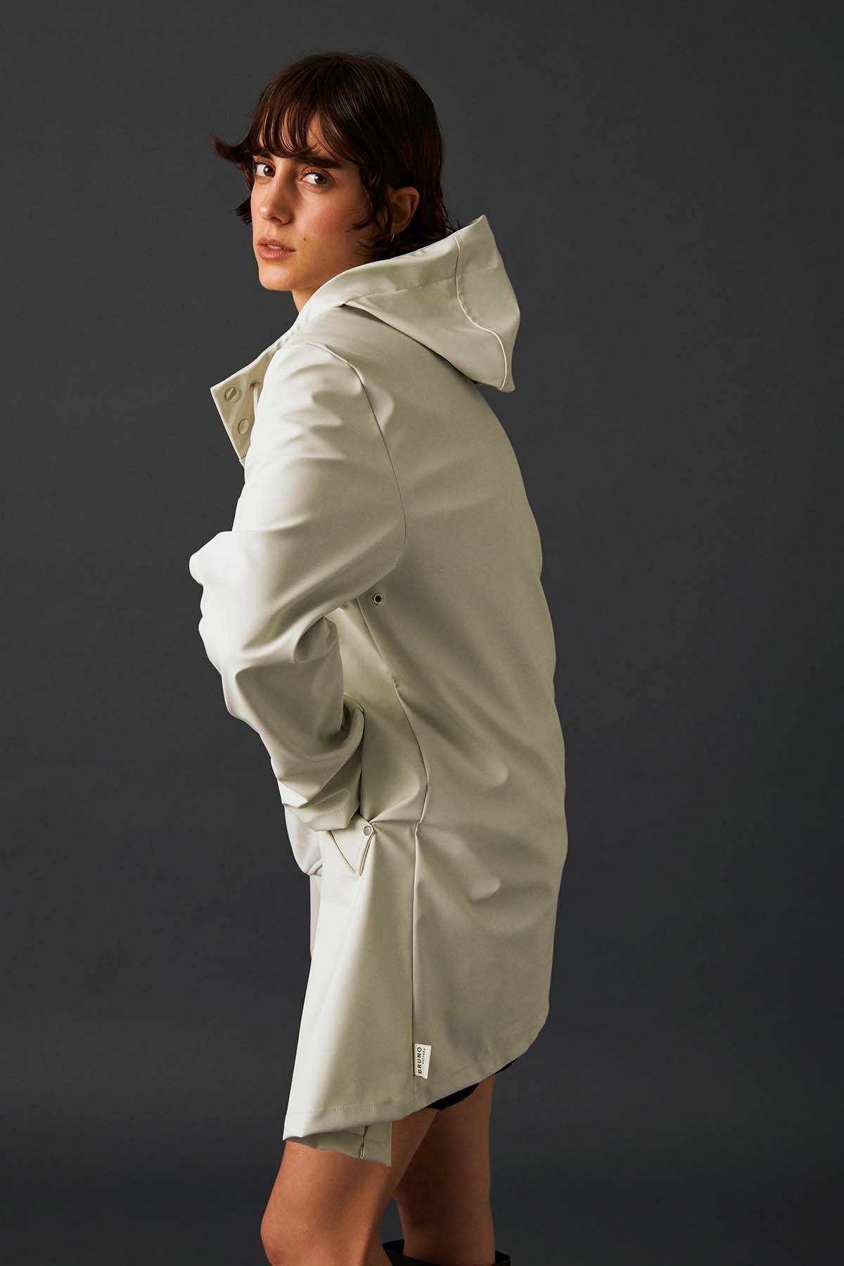 İnsan: Mat ve pürüzsüz bir yüzeye sahip suya dayanıklı hafif kumaştan üretilmiş , kol altında hava sirkülasyonu için gizli açıklıklar bulunan, kapüşonu büzgü bağlı, çapraz ön cepli, önü çıtçıtlı rahat kesim unisex yağmurluk
