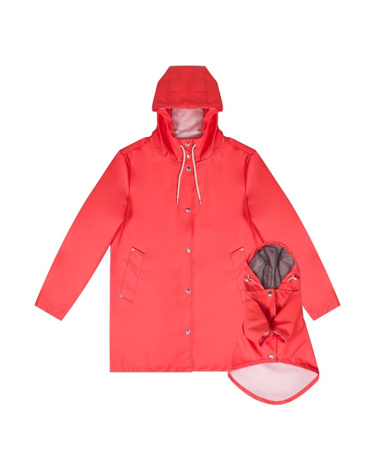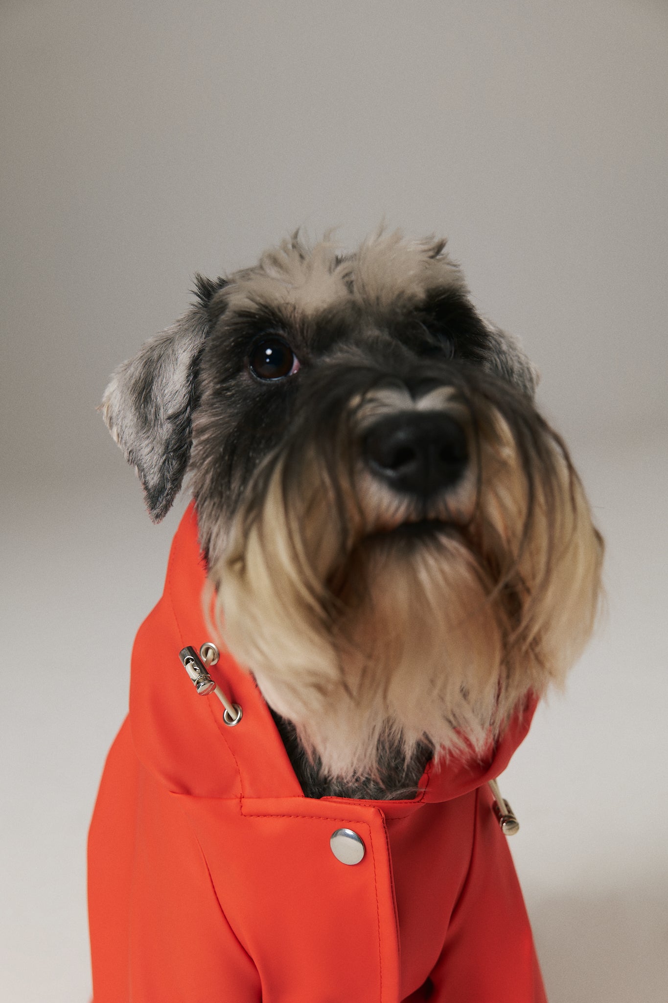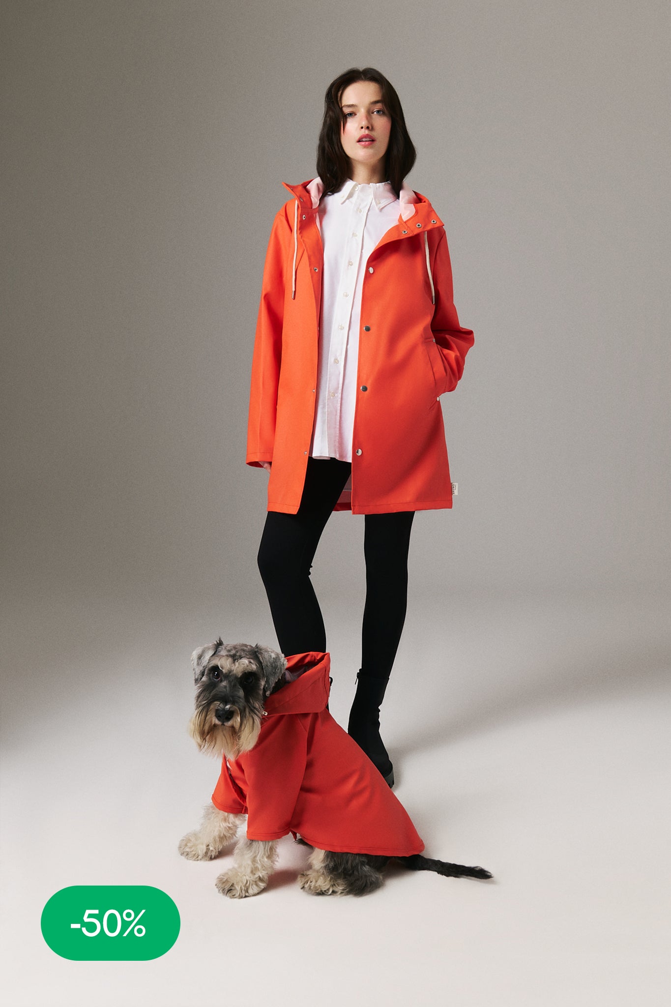 Köpek: Mat ve pürüzsüz bir yüzeye sahip suya dayanıklı hafif kumaştan üretilmiş, kapüşonu lastik ve stoperle ayarlanabilen, önü çıtçıtlı, kolay ve rahat yürüyüşler için tasma deliği bulunan astarsız rahat kesim yağmurluk