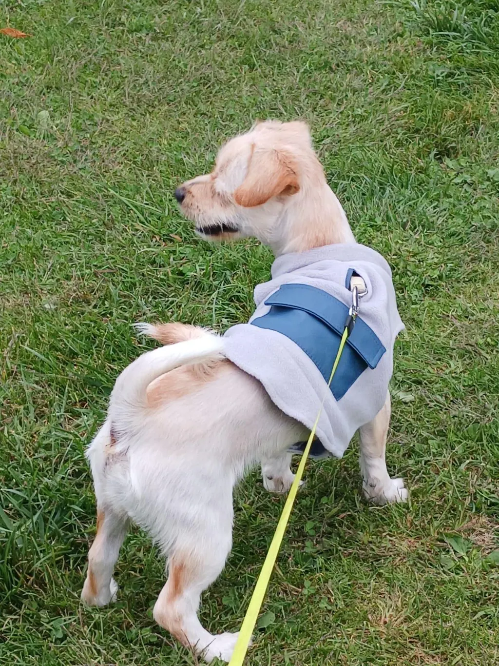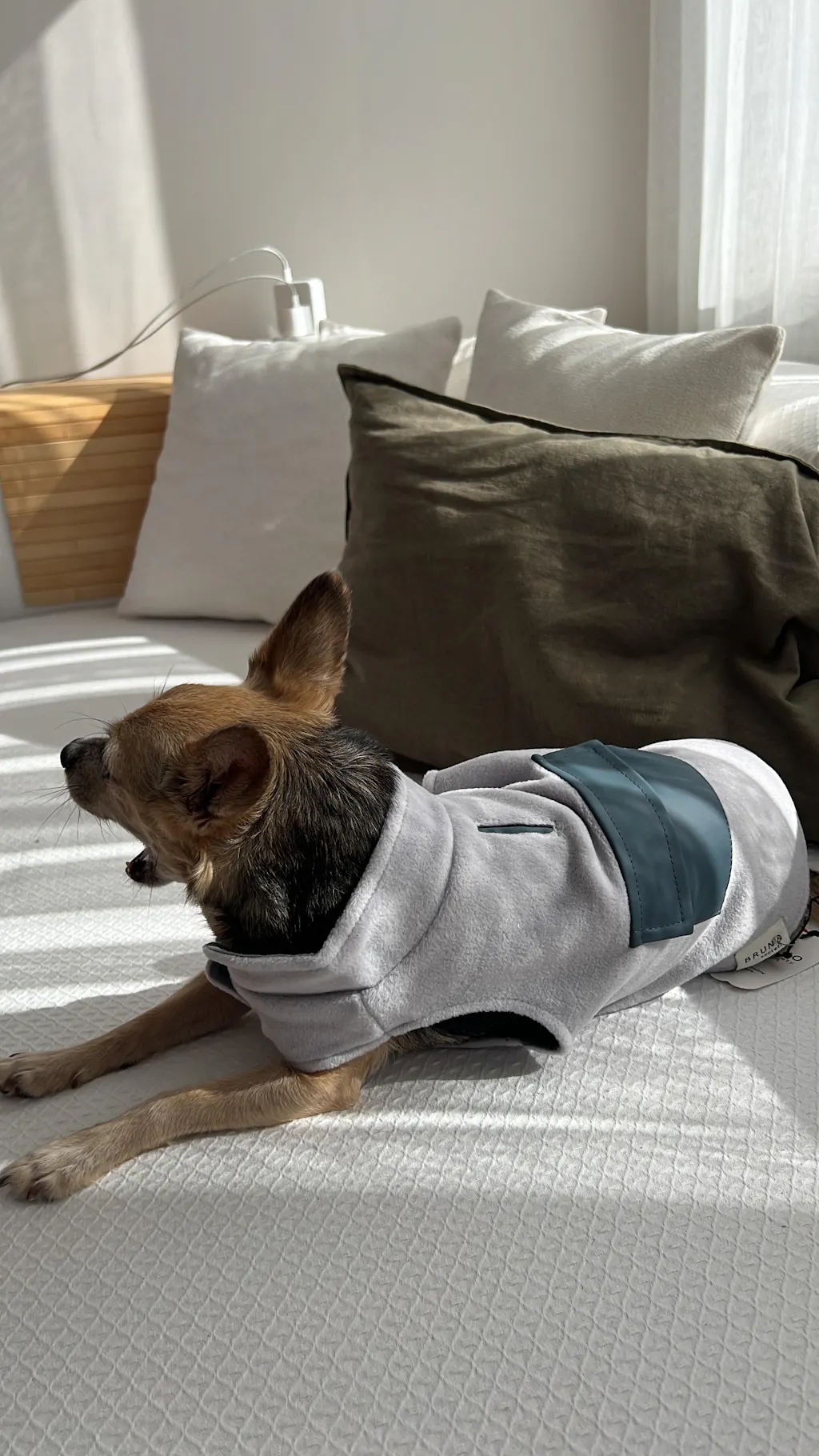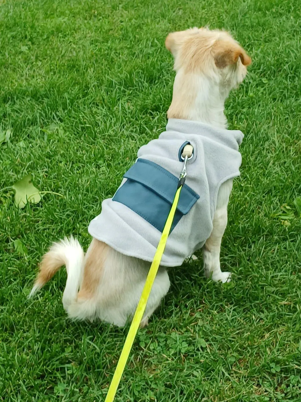 Featuring contrast colored zip pocket, front placket with snap buttons, harness keyhole for easy and comfortable walks, relaxed fit polar