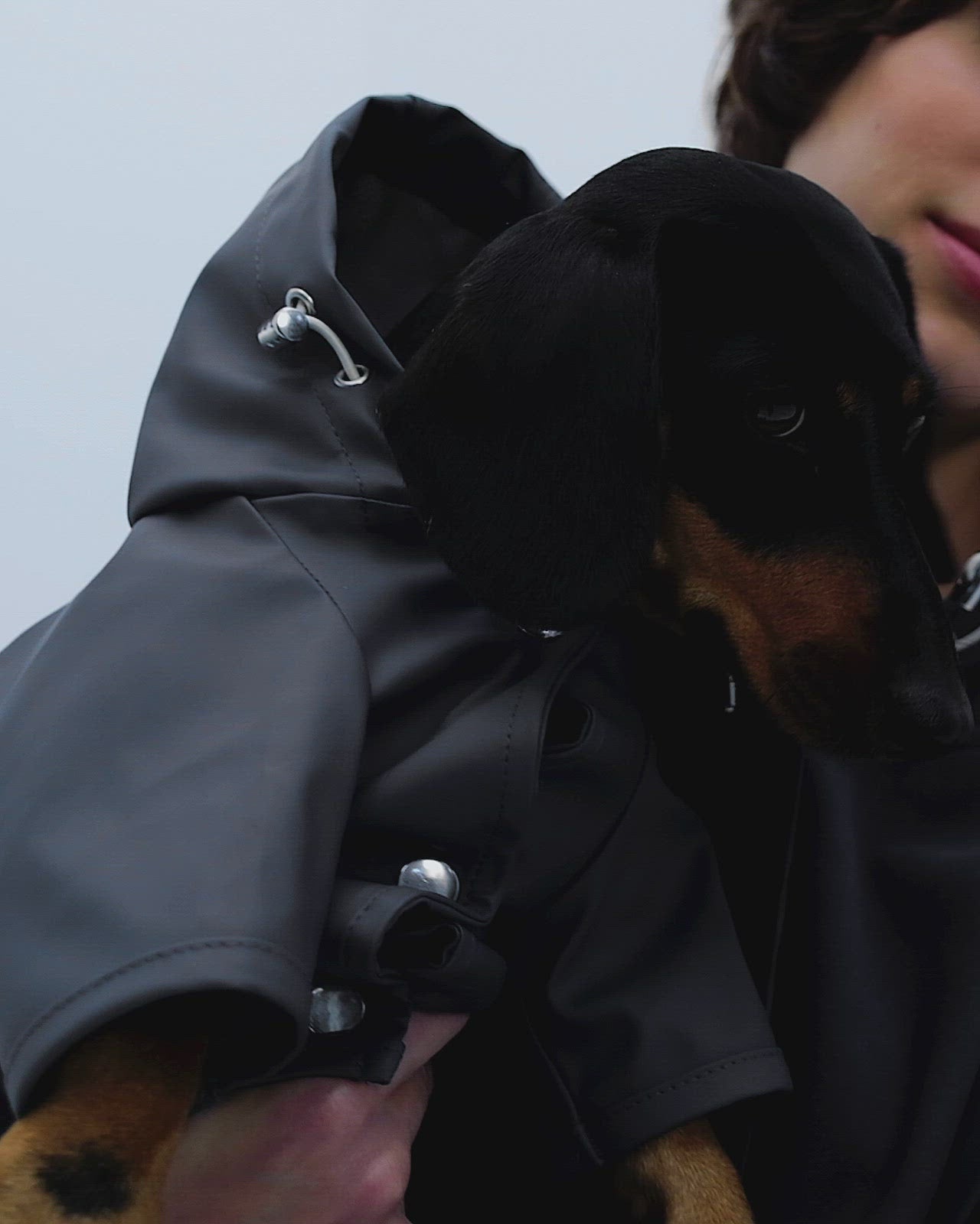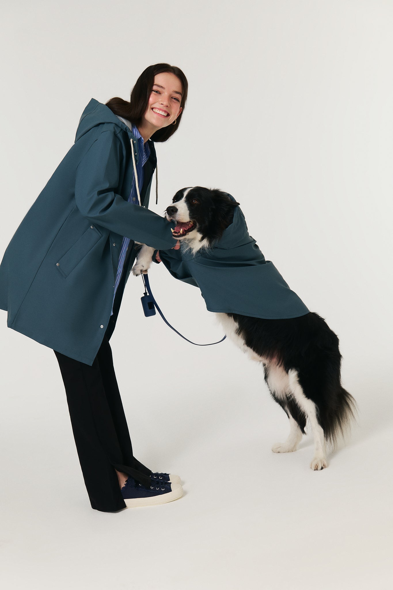 Water-resistant lightweight fabric with a matte and smooth finish, front placket with snap buttons, adjustable hood with drawstrings & practical cap function, harness keyhole for easy and comfortable walks, unlined casual fit raincoat