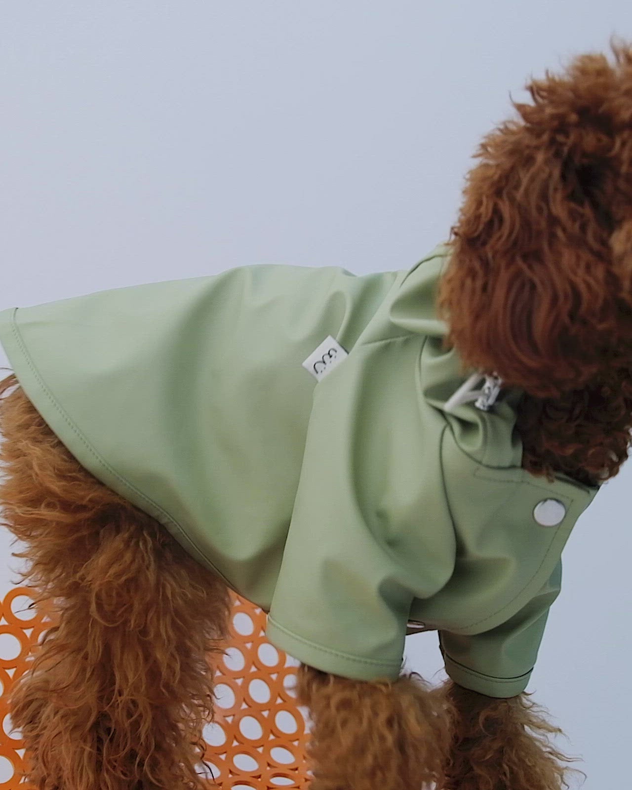 Water-resistant lightweight fabric with a matte and smooth finish, front placket with snap buttons, adjustable hood with drawstrings & practical cap function, harness keyhole for easy and comfortable walks, unlined casual fit raincoat