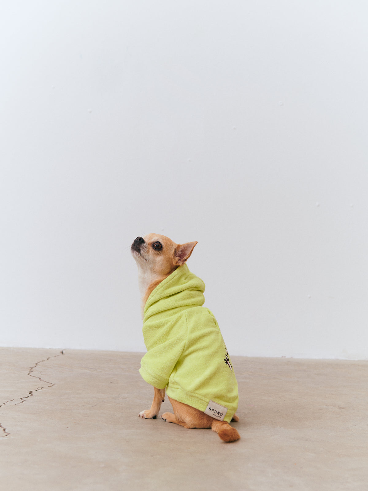 Soft towel fabric with outer soft and velvet-like feeling, ribbing at cuffs & hem, harness keyhole for easy and comfortable walks, relaxed fit hoodie