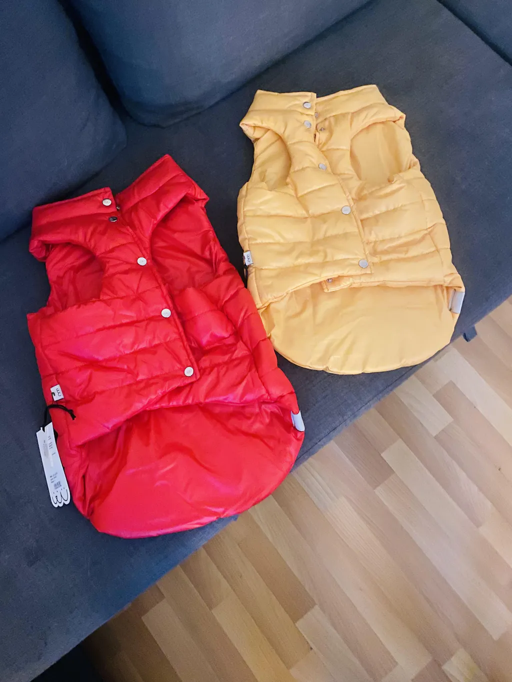 A comfortable dog puffer jacket made of fabric with thick padding resistant to cold and water, featuring a snap button with logo print and a leash hole for easy and comfortable walks.