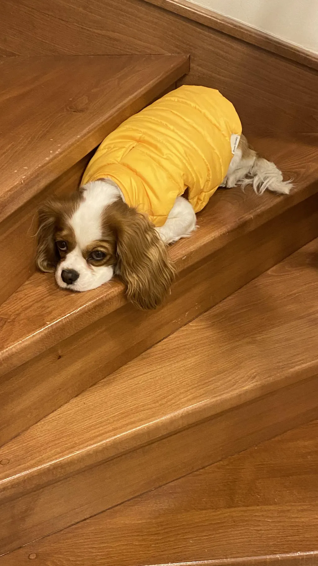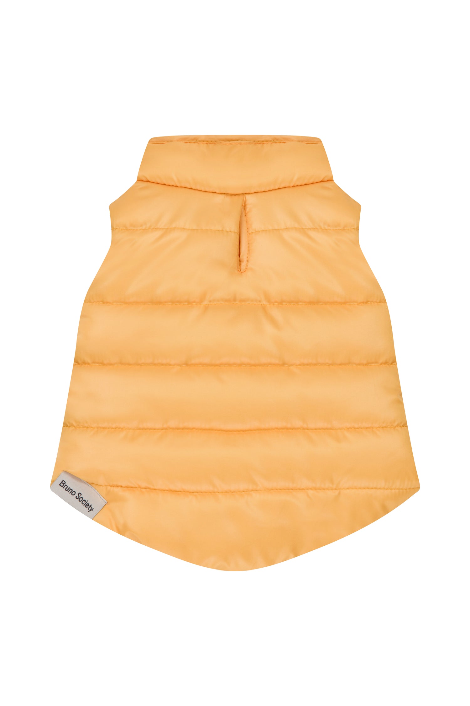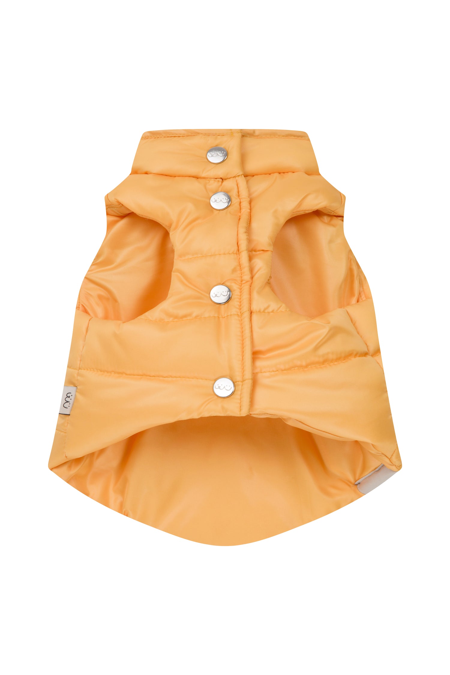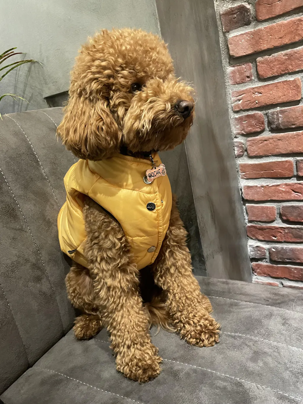 A comfortable dog puffer jacket made of fabric with thick padding resistant to cold and water, featuring a snap button with logo print and a leash hole for easy and comfortable walks.