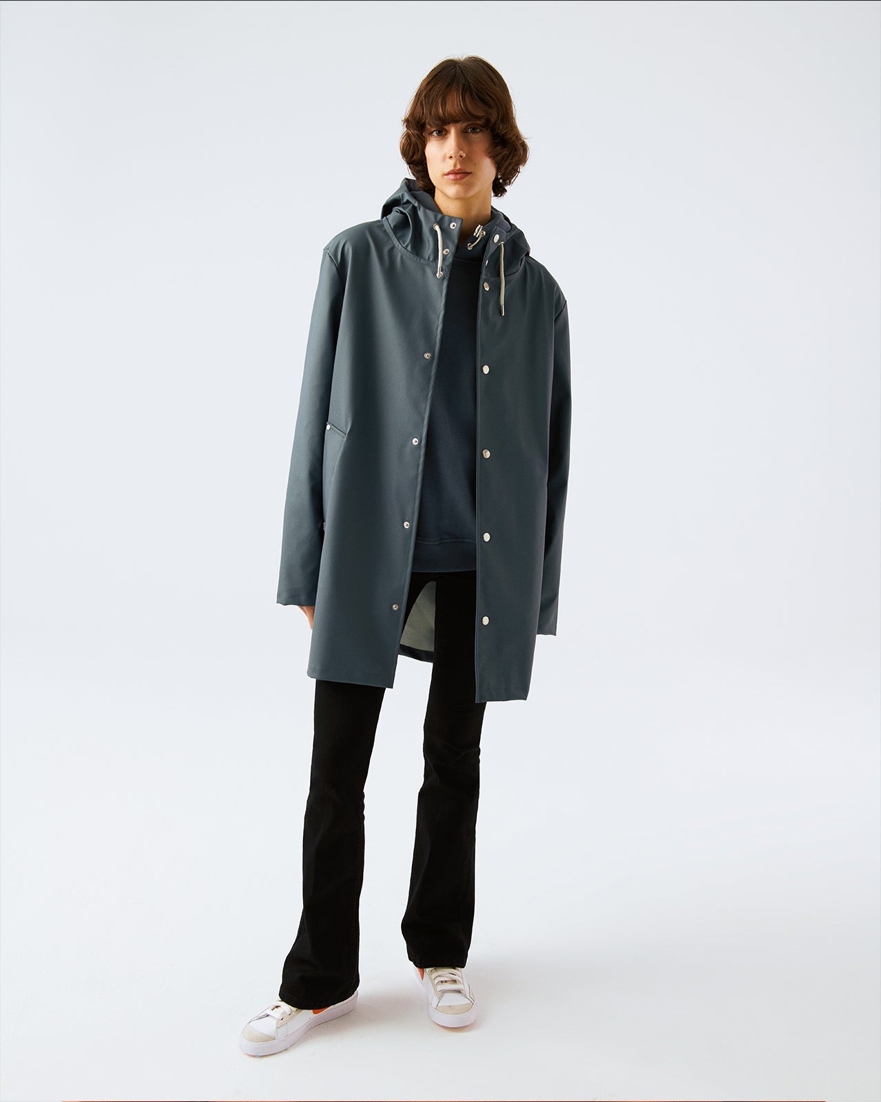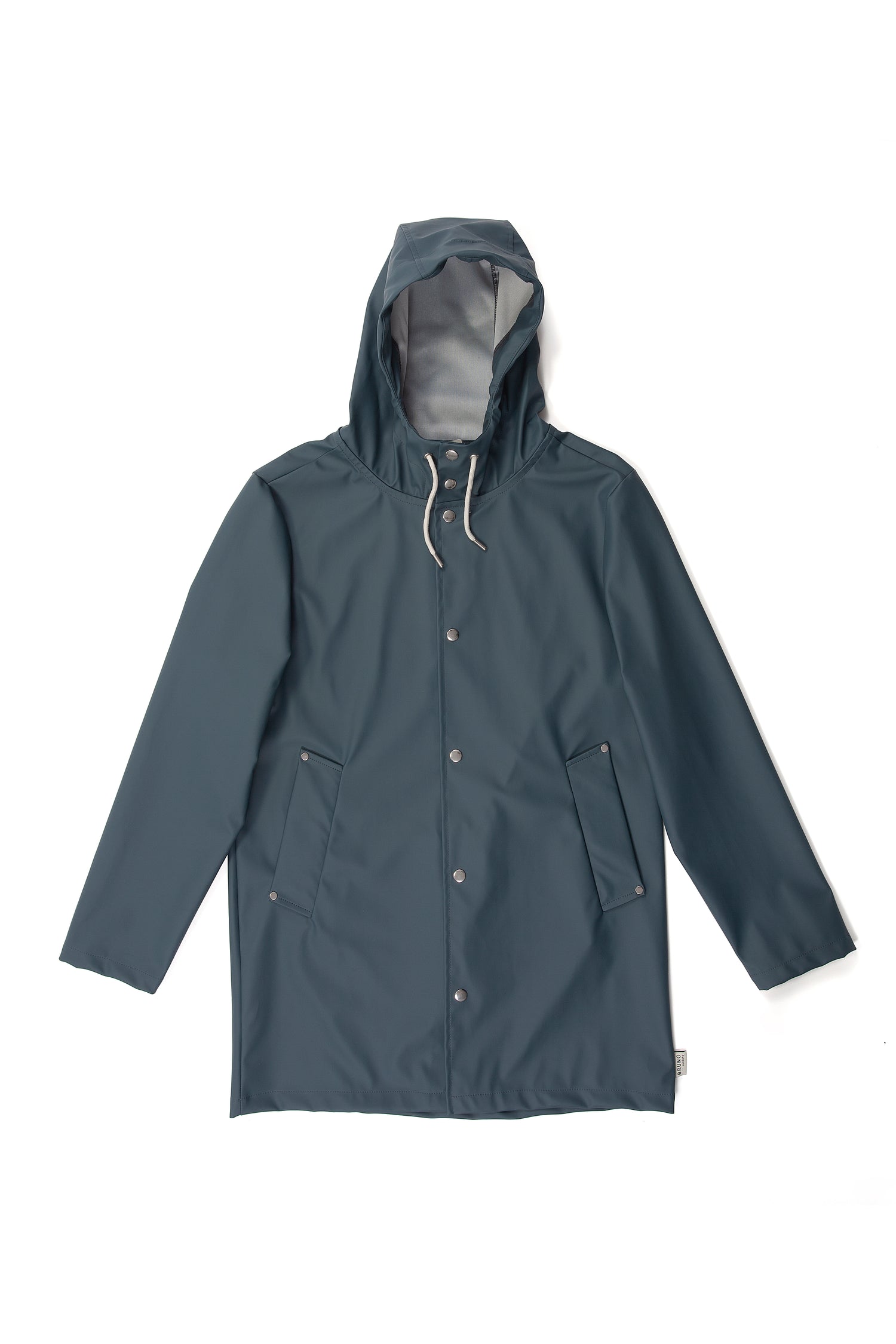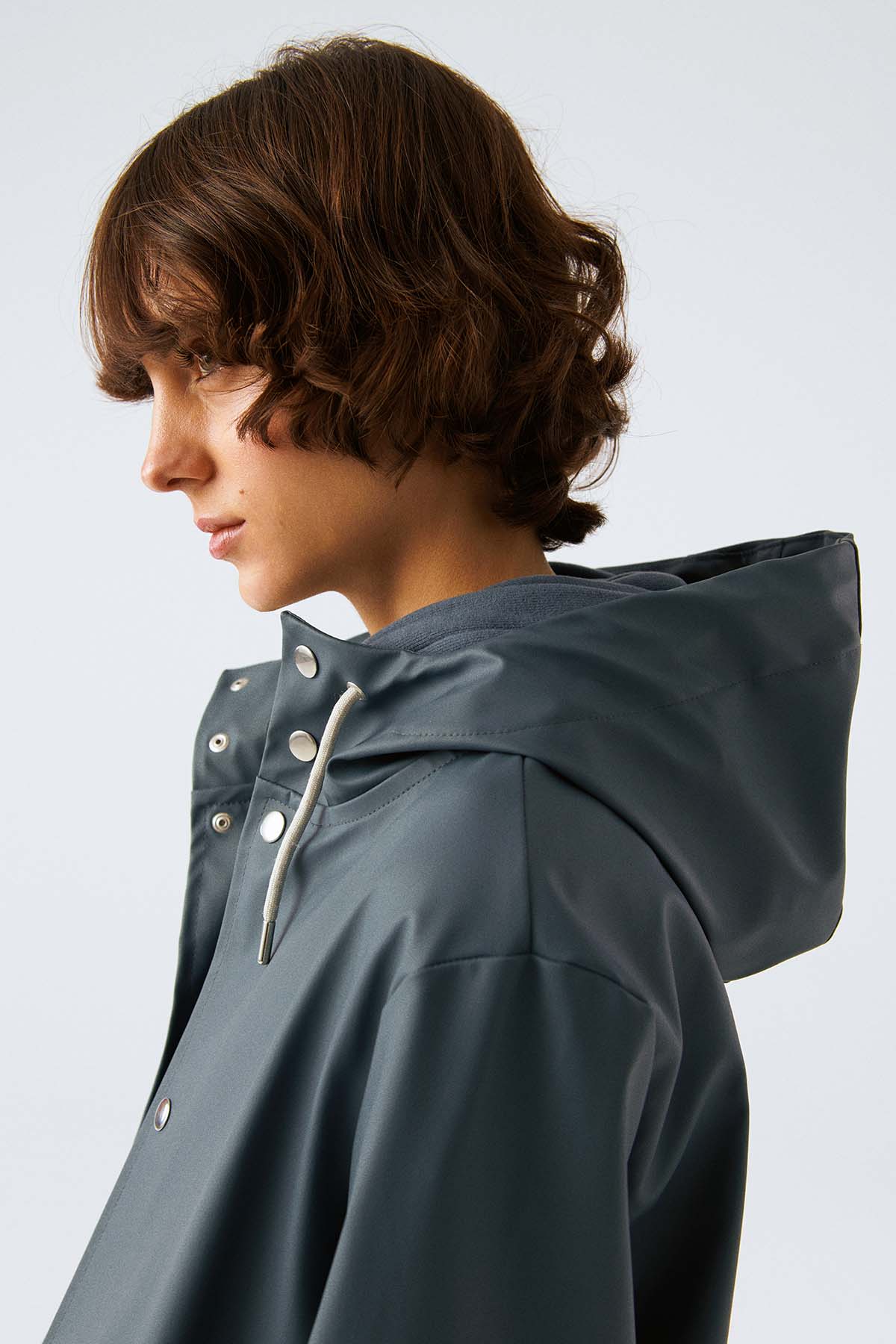 İnsan: Mat ve pürüzsüz bir yüzeye sahip suya dayanıklı hafif kumaştan üretilmiş , kol altında hava sirkülasyonu için gizli açıklıklar bulunan, kapüşonu büzgü bağlı, çapraz ön cepli, önü çıtçıtlı rahat kesim unisex yağmurluk