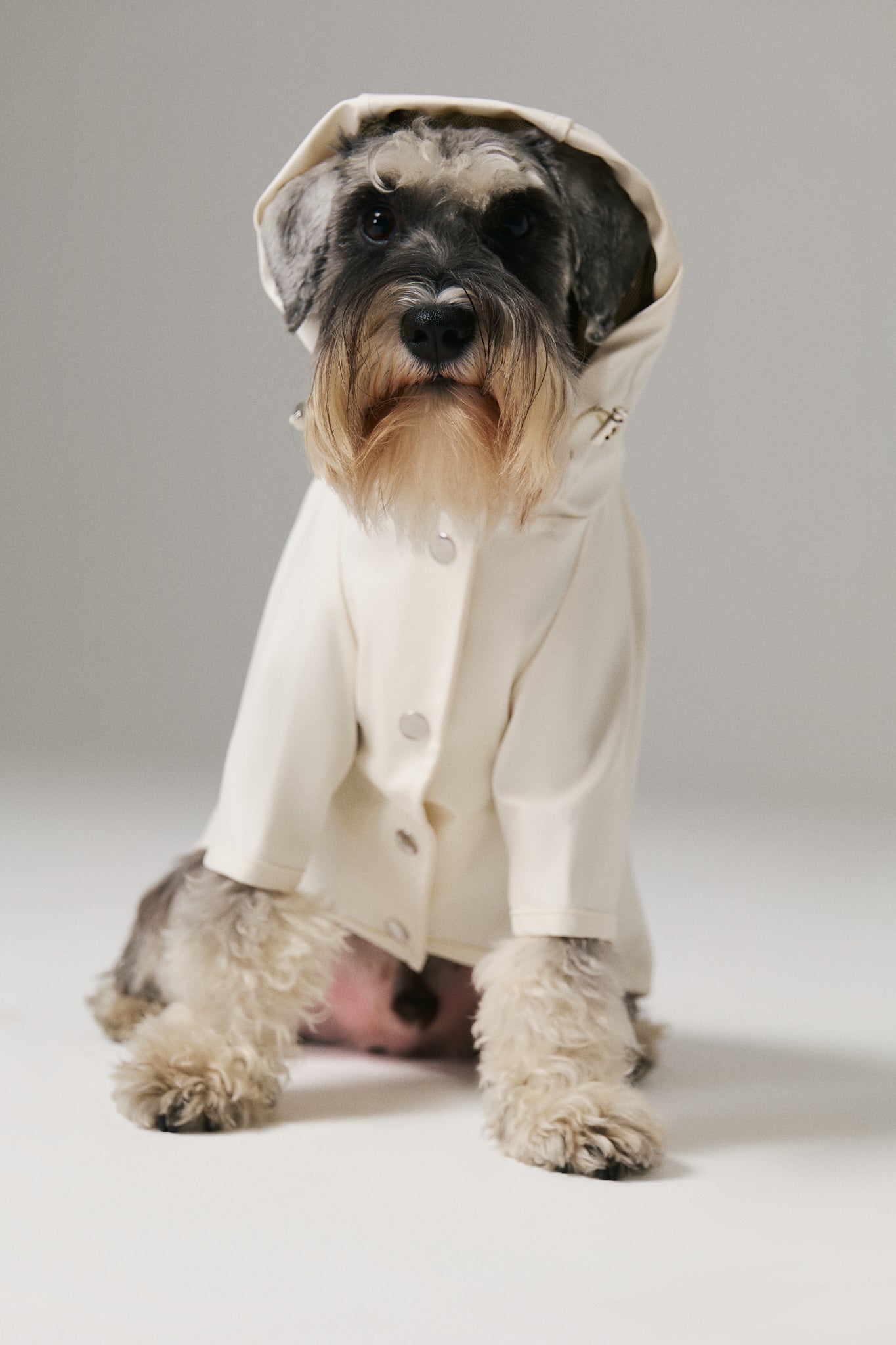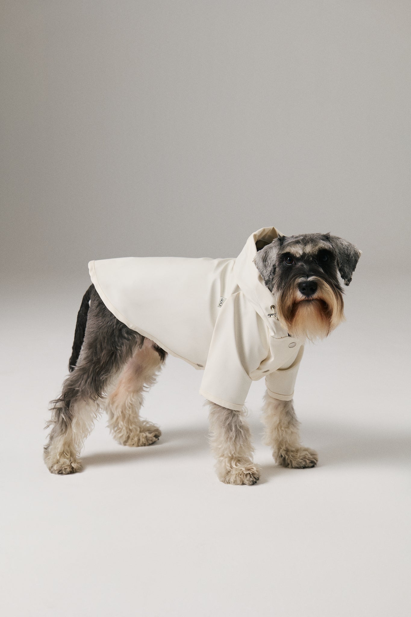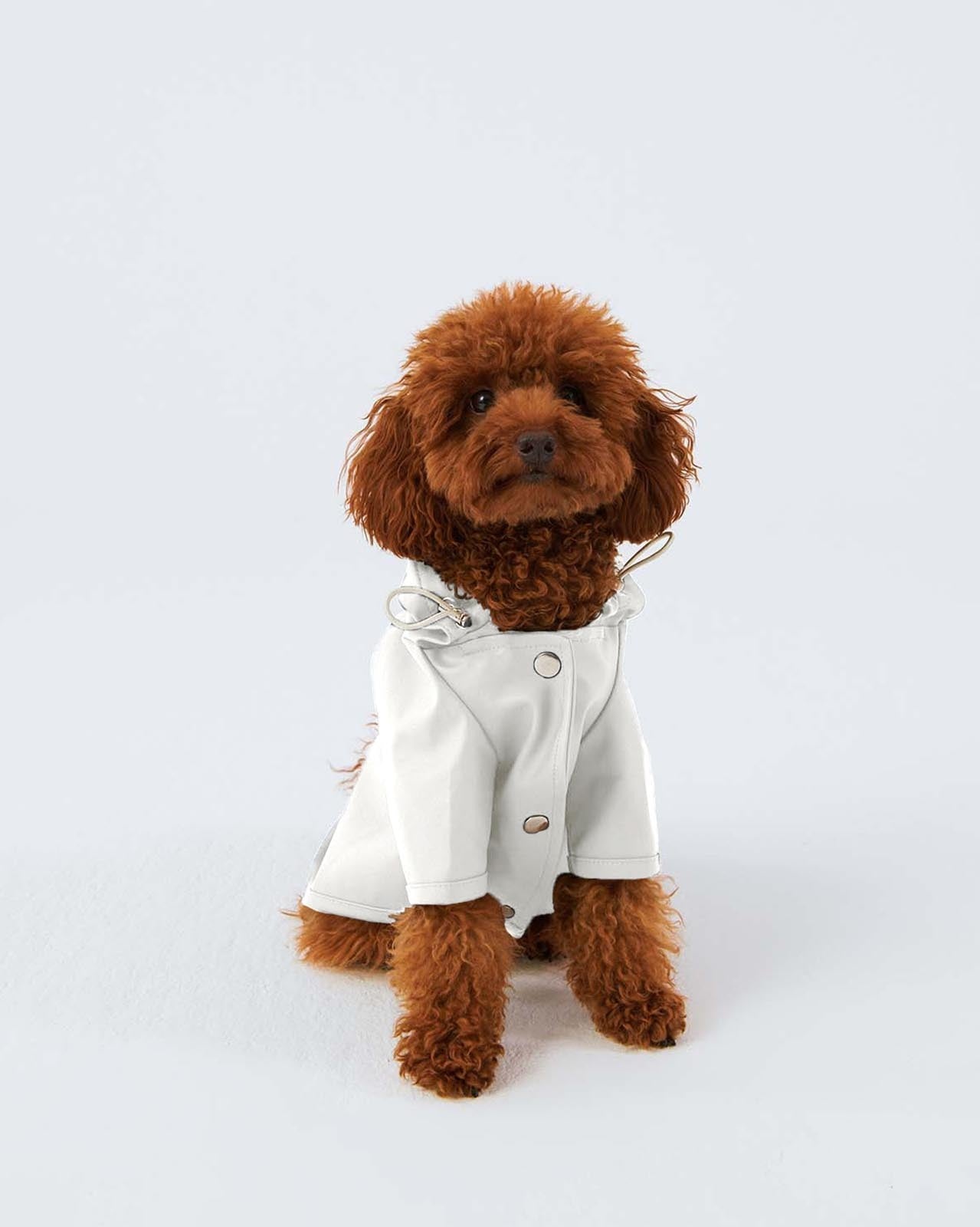 Mat ve pürüzsüz bir yüzeye sahip suya dayanıklı hafif kumaştan üretilmiş, kapüşonu lastik ve stoperle ayarlanabilen, önü çıtçıtlı, kolay ve rahat yürüyüşler için tasma deliği bulunan astarsız rahat kesim köpek yağmurluk