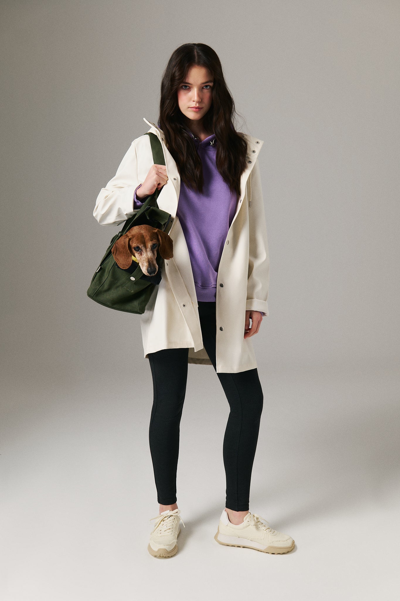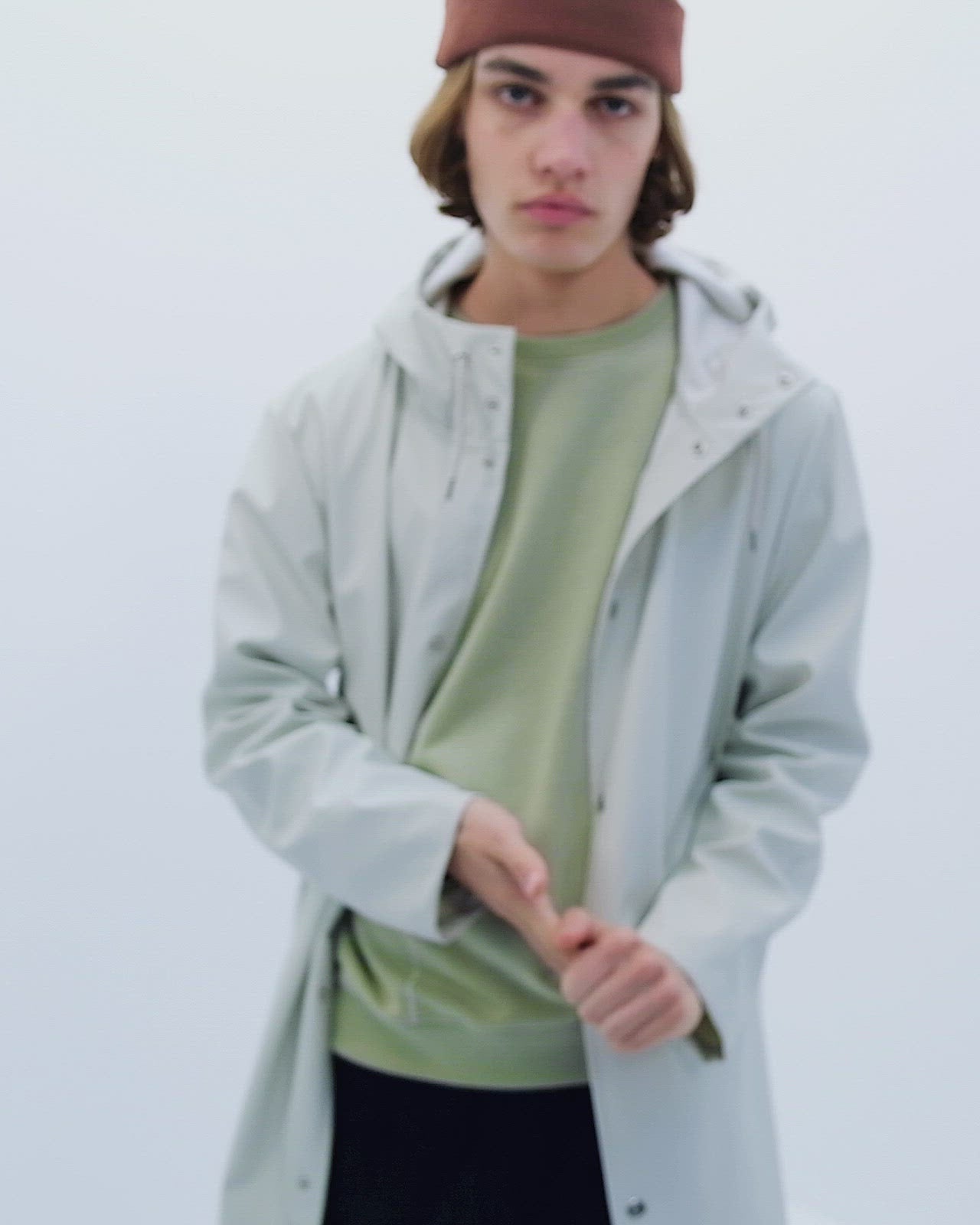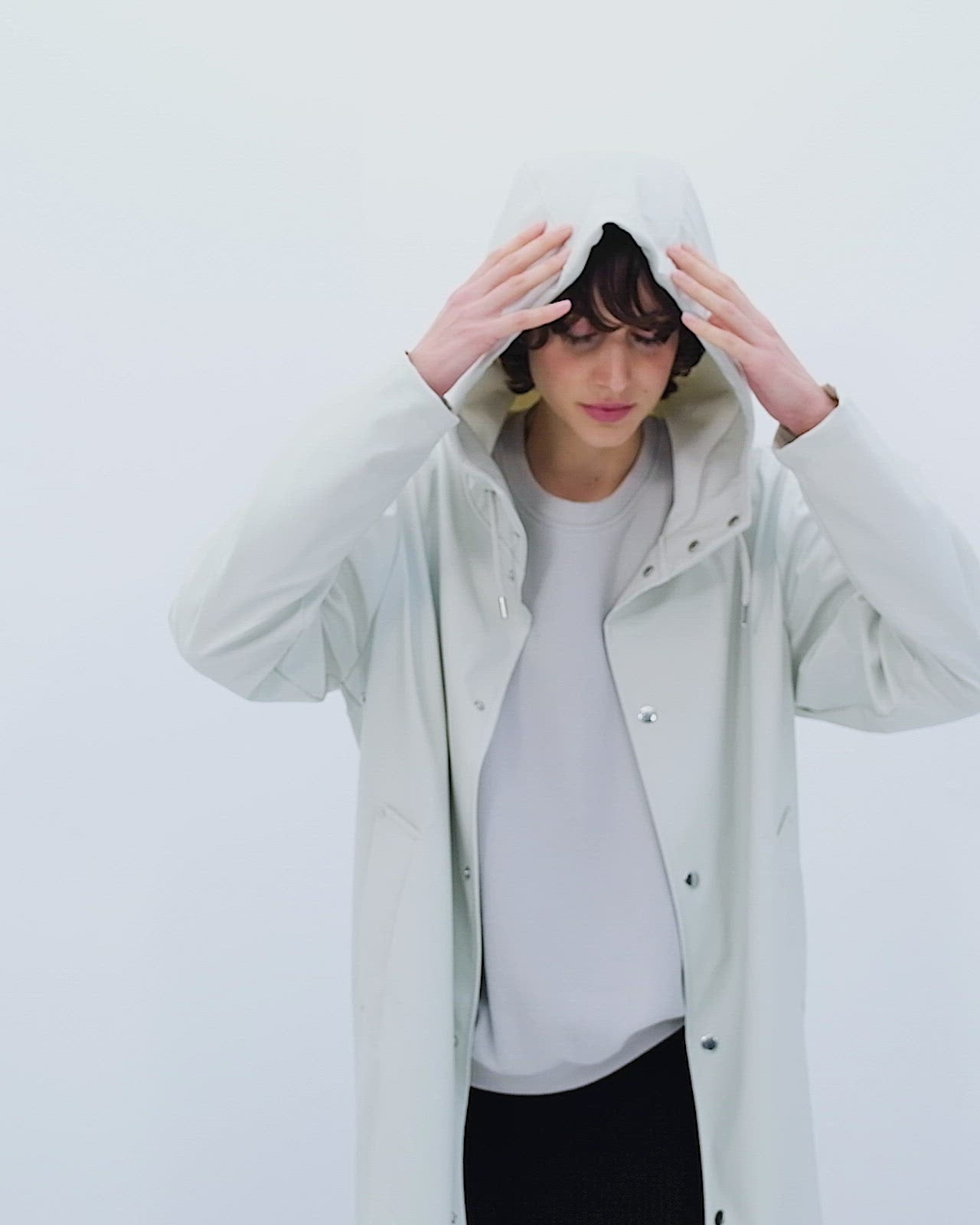 Mat ve pürüzsüz bir yüzeye sahip suya dayanıklı hafif kumaştan üretilmiş , kol altında hava sirkülasyonu için gizli açıklıklar bulunan, kapüşonu büzgü bağlı, çapraz ön cepli, önü çıtçıtlı rahat kesim astarsız unisex yağmurluk