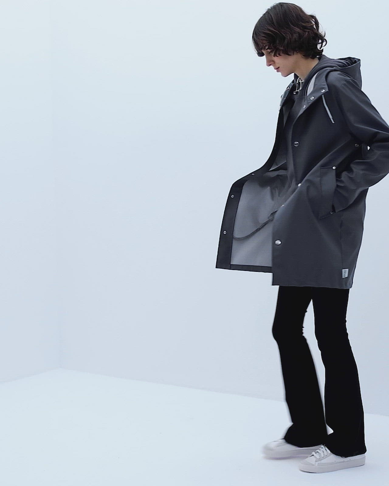 Mat ve pürüzsüz bir yüzeye sahip suya dayanıklı hafif kumaştan üretilmiş , kol altında hava sirkülasyonu için gizli açıklıklar bulunan, kapüşonu büzgü bağlı, çapraz ön cepli, önü çıtçıtlı rahat kesim astarsız unisex yağmurluk